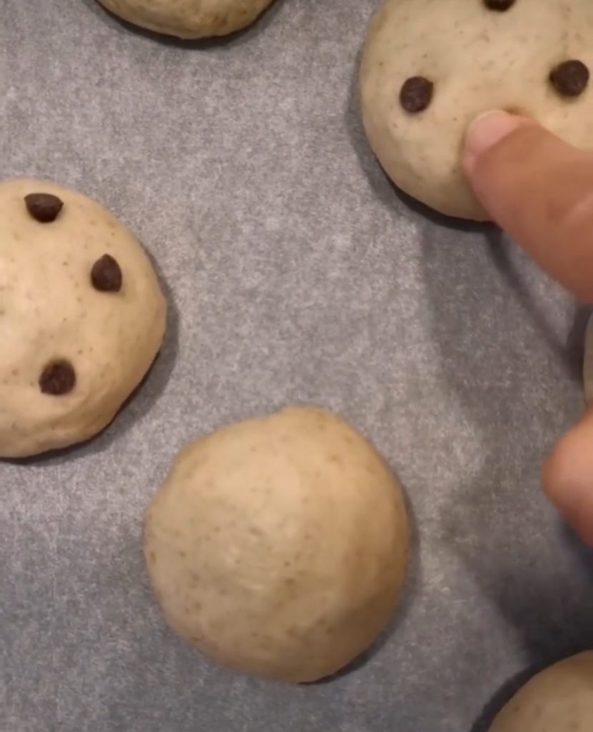 Formen Sie die Stücke und lassen Sie sie erneut auf Backpapier für mindestens weitere zwei Stunden gehen. Wenn sie schön hoch sind, sind sie bereit, gebacken zu werden. Ich habe Schokoladentropfen hinzugefügt. Machen Sie es nach Ihrem Geschmack.