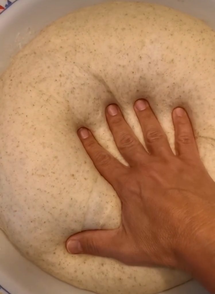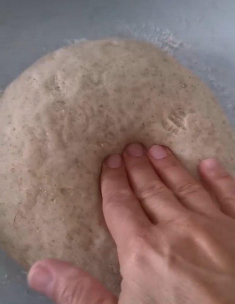 Wenn es nicht mehr möglich ist, den Teig mit der Gabel zu rühren, beginnen Sie, mit den Händen zu arbeiten, bis ein schöner Teig entsteht, der nicht an den Fingern klebt, aber schön weich ist.