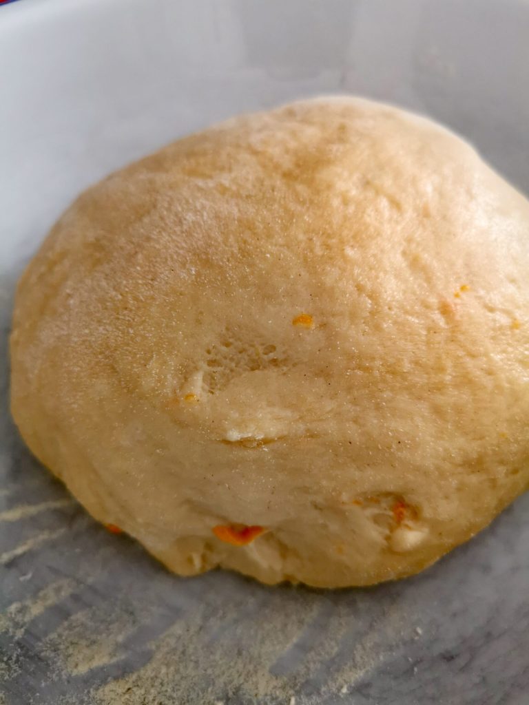 Sobald der Teig fertig ist, lassen Sie ihn in einer mit Folie bedeckten Schüssel etwa 2/3 Stunden aufgehen, bis sich das Volumen des Teigs verdoppelt hat.