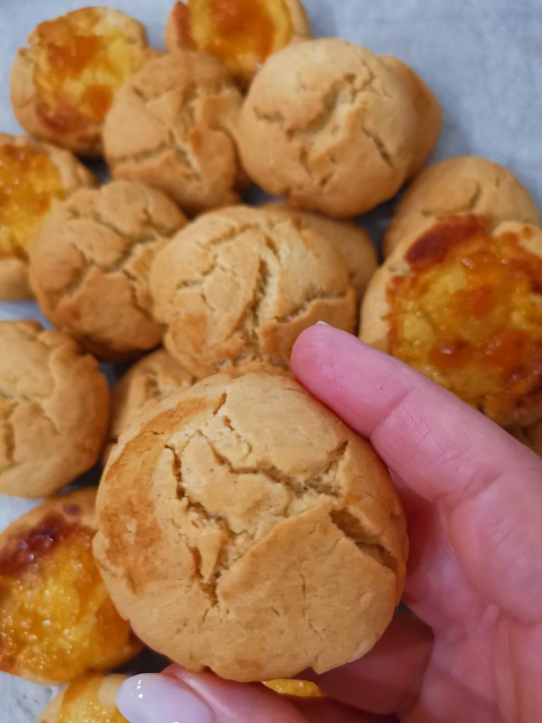 Wie ihr auf dem Foto seht, habe ich den Teig einfach zwischen den Händen gerollt, um Kugeln zu formen. Wo ich Marmelade hineingegeben habe, habe ich mit dem Finger ein Loch in die Mitte gemacht, das ich dann mit der bevorzugten Konfitüre gefüllt habe.