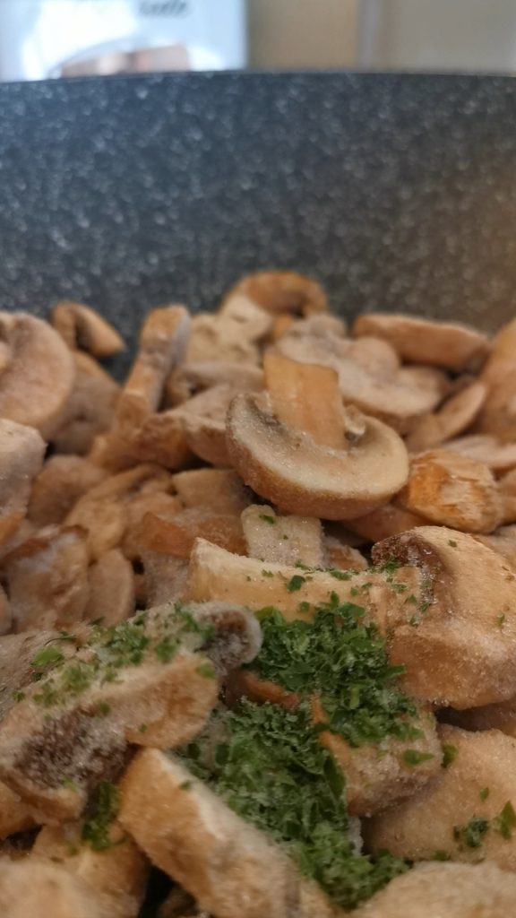 • Zuerst nehmen wir unsere Pfanne und geben hinein den Knoblauch, die Pilze (ich verwende auch gefrorene), die Petersilie, das Salz und einen Schuss Olivenöl extra vergine.