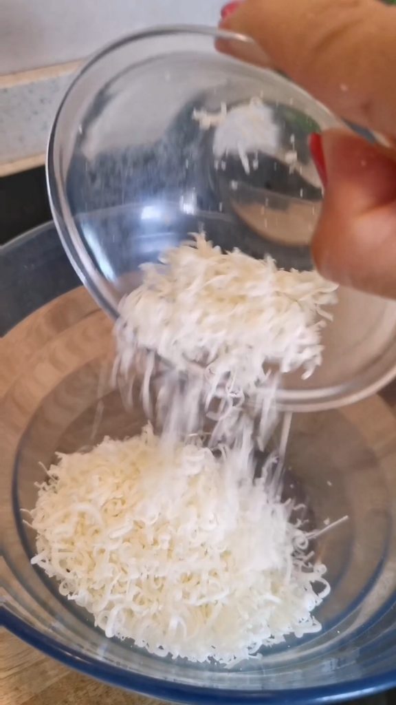 In einer Schüssel beginnen wir den Parmesan, die Milch, das Öl, das Salz und das Mehl einzufügen.