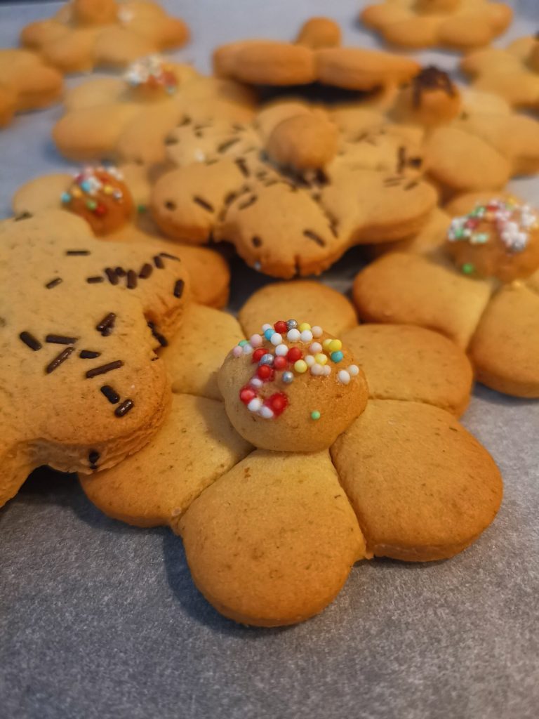 Die einfachen Blumenplätzchen sind Mürbeteigplätzchen mit Öl, aromatisiert mit Orangenblütenwasser und Likör, die sich ohne Schwierigkeiten herstellen lassen. Ihr Charakteristikum ist dieser Duft nach alten Süßigkeiten, die unsere Großmütter gebacken haben.