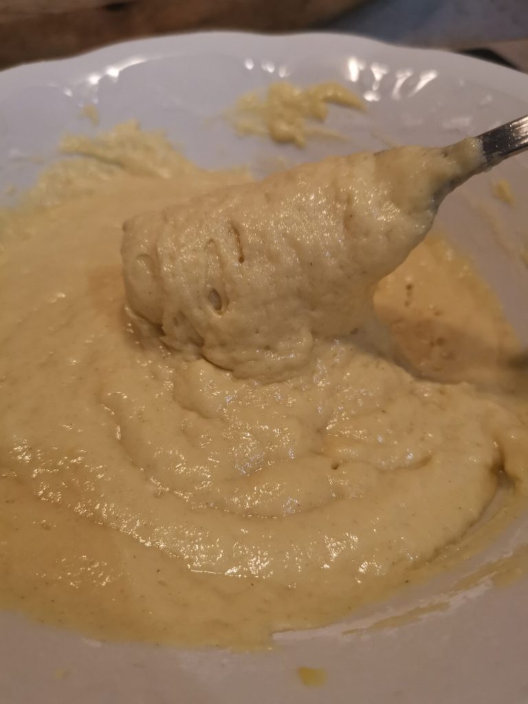 Wir sieben zusammen die das Mehl, das Backpulver und die Kartoffelstärke und geben sie nach und nach zur Mischung hinzu.