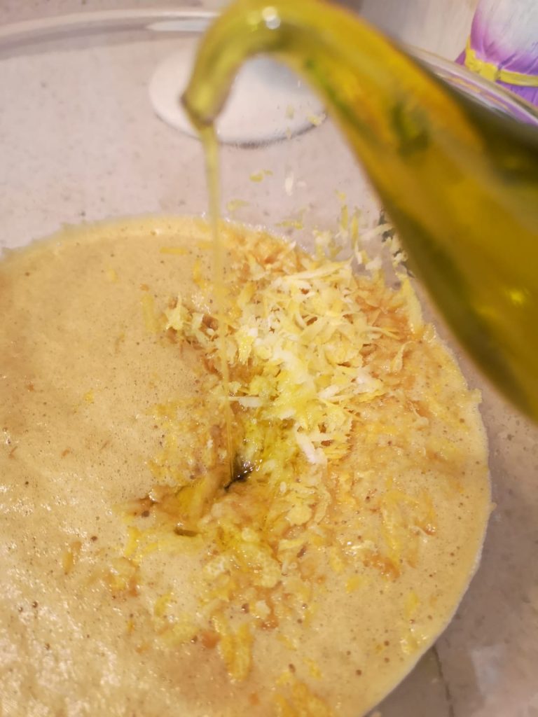 Auch das Öl sollte langsam in einem dünnen Strahl zugegeben werden, genau wie im Rezeptbild gezeigt, damit der Teig homogen und luftig bleibt.