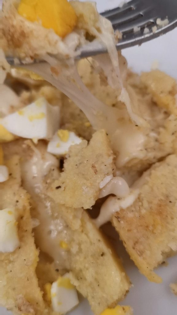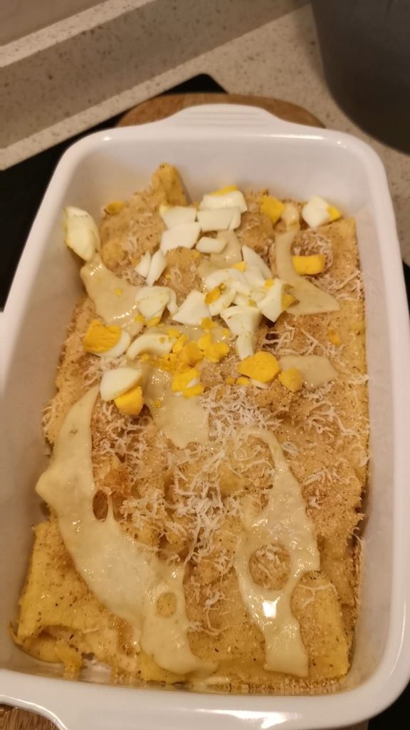 Jetzt nehmt die hartgekochten Eier, die ihr zuvor gekocht habt, und schneidet sie in Stücke, um sie auf der Oberfläche zu verteilen. Noch eine Prise Semmelbrösel, ein Schuss Öl und ab zum Gratinieren.