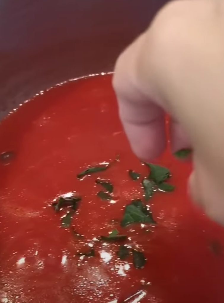 Wir fügen die passierten Tomaten hinzu, die Basilikumblätter, den Chili und lassen alle Zutaten zusammen fünf bis zehn Minuten köcheln.