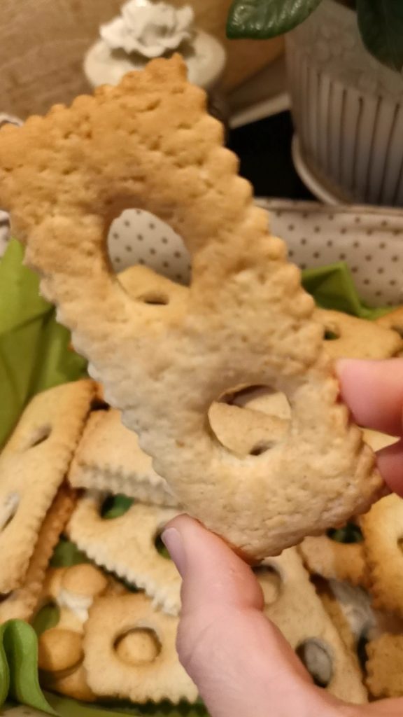 Ich habe den Teig etwas dicker gelassen, den Teig mit einem Teigrad geschnitten, als ob ich „Chiacchiere, Bugie“ schneiden würde, um es klar zu machen, ein Rechteck geschaffen und dann nach dem Schneiden der Streifen habe ich einen Ausstecher verwendet, um das Loch oben zu machen.