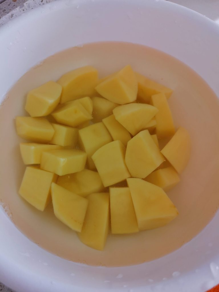 Sobald die Sauce fertig ist, legen wir sie beiseite und kochen in einem Topf mit Salzwasser die in Würfel geschnittenen Kartoffeln, die wir etwa eine halbe Stunde lang in Wasser eingeweicht haben, um die Stärke abzubauen.