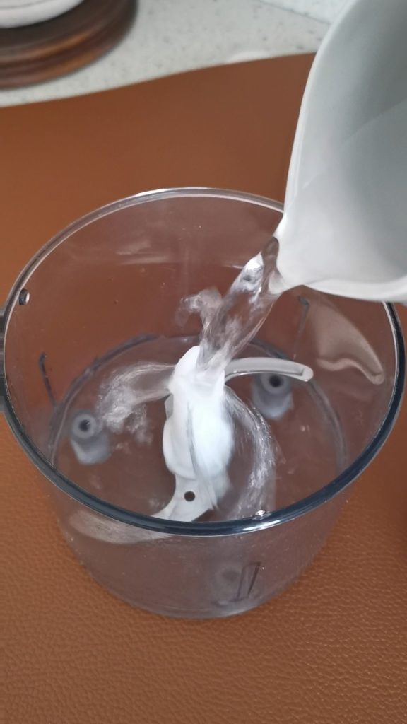 Nehmen Sie den Mixer oder eine Küchenmaschine und geben Sie das Wasser bei Zimmertemperatur hinein.