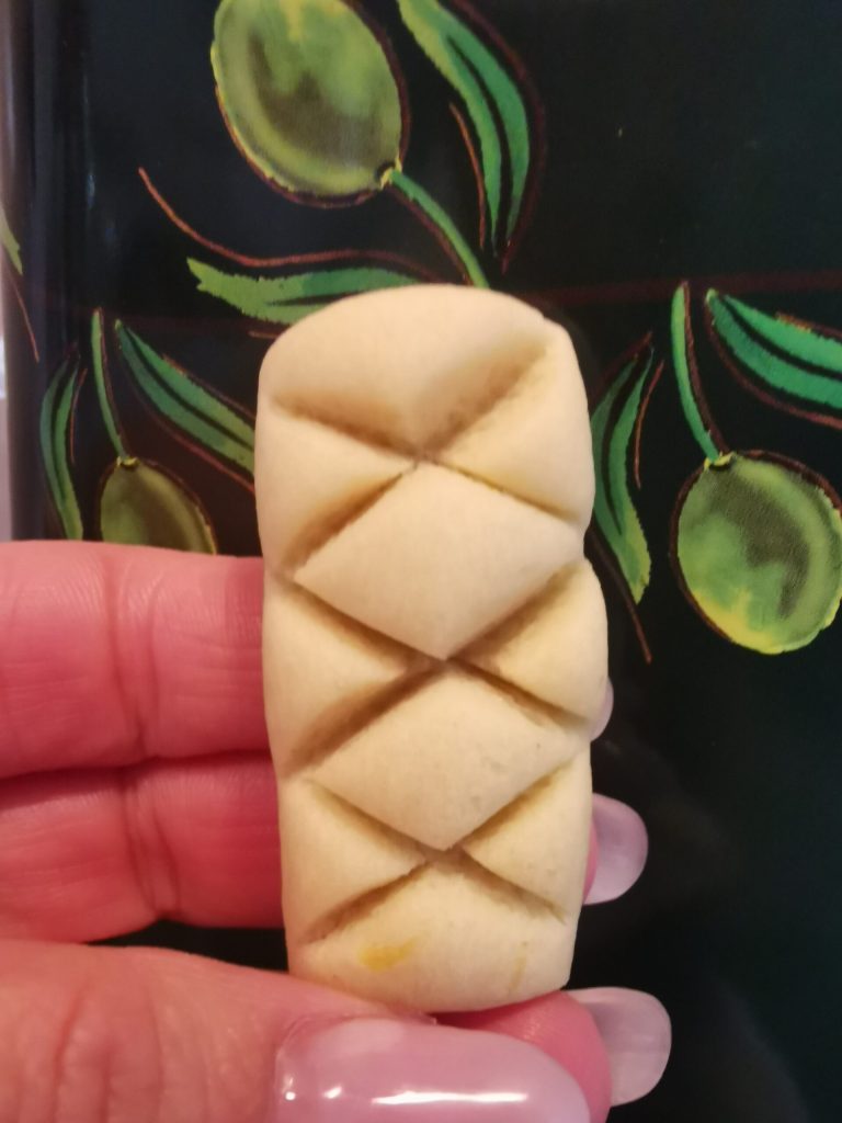 Mit einem Messer oder einem Abstecher habe ich die Teigstangen in Stücke geschnitten, die ich dann von Hand mit einem Messer eingeritzt habe, um die Dekoration zu erstellen, die Sie sehen.