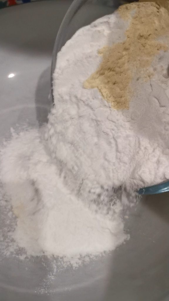 In eurer Schüssel mischt ihr die zwei Mehlsorten miteinander. Macht eine Art Mulde in der Mitte des Mehls (die Fontaine) und fügt den Zucker, das Salz, das Natron und die Schokoladenstückchen hinzu. In meinem Fall auch die getrockneten oder kandierten Früchte, die ich nach Weihnachten zu Hause hatte.