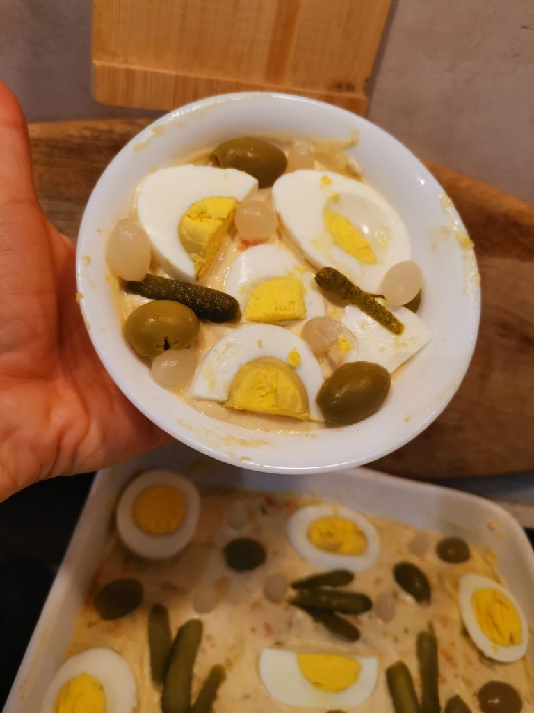 Wenn Sie möchten, können Sie mein Rezept für den russischen Salat nachkochen, klicken Sie hier für das Rezept RUSSISCHER SALAT, einfach und lecker, oder Sie können ihn in den Feinkostabteilungen von Supermärkten oder in Delikatessenläden kaufen.
