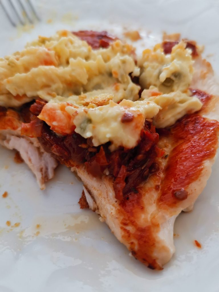 Auf jede Scheibe habe ich oben die in Öl eingelegten getrockneten Tomaten hinzugefügt, so begann das Fleisch, den Geschmack des Tomatenöls aufzunehmen und weicher zu werden.