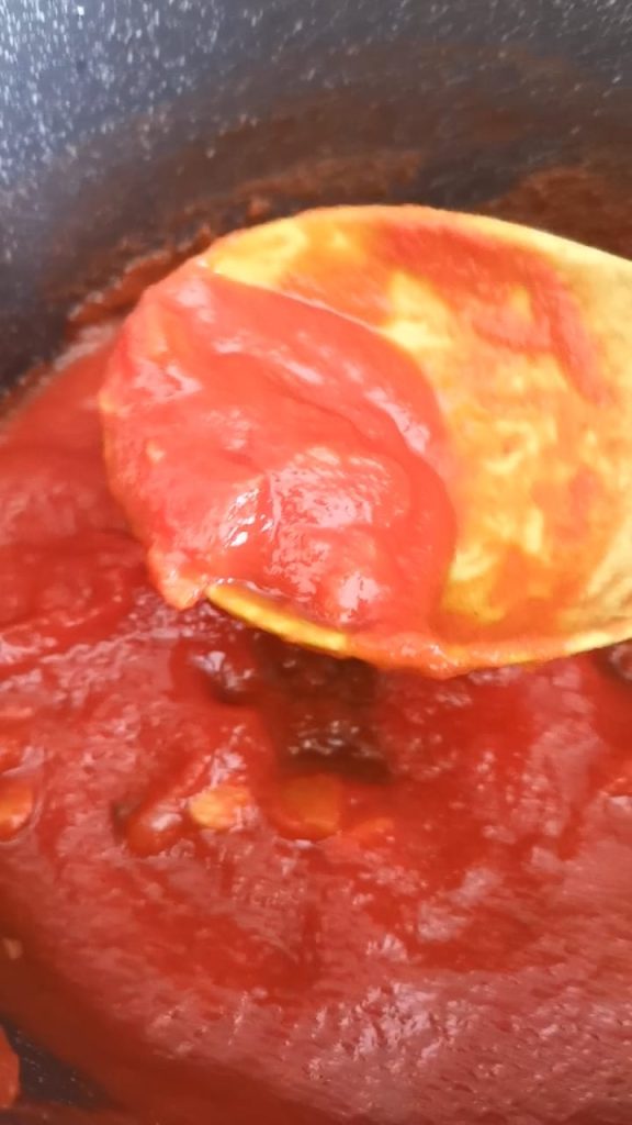In einer Pfanne gib den Knoblauch, die Zwiebel und ein wenig Karotte hinzu, füge die Tomatenpassata hinzu, eine Prise Salz und eine Prise Zucker und koche für 10-15 Minuten.