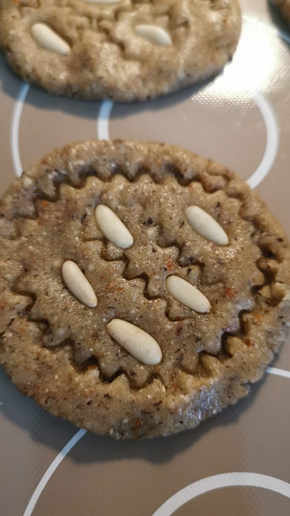 Ich habe es rund um den Keksperimeter geführt und auch Schnitte in der Mitte gemacht, wo ich nach Belieben Pinienkerne eingefügt habe.