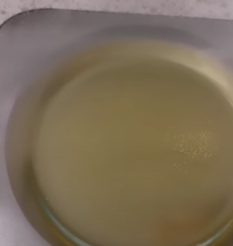 Jetzt nehmen wir den Behälter und stellen ihn für 40 Sekunden in die Mikrowelle. Nach der Zeit nehmen wir ihn aus der Mikrowelle, rühren um und fangen an, die Milch langsam hinzuzufügen, bis sie vollständig eingearbeitet ist, dabei ständig mit dem Schneebesen rühren.