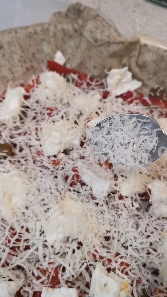 • An diesem Punkt falten wir die Ränder des Teigs nach innen und streuen Parmesan und, wenn ihr mögt, einige Samen darüber. Ich habe Kürbiskerne verwendet. Die kleinen Samen bringen viele Vorteile für unseren Körper. Am Ende des Rezepts gebe ich euch ein paar zusätzliche Informationen zur Nutzung und Aufnahme dieser Samen.