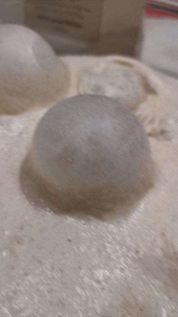 Am folgenden Tag, hole ich die Kugeln aus dem Kühlschrank, gegen 11 Uhr morgens, und lasse sie bis 14 Uhr bei Raumtemperatur. Zu diesem Zeitpunkt, am frühen Nachmittag, werdet ihr sehen, dass der Teig schön aufgegangen ist und die berühmten Blasen auf der Oberfläche entstanden sind.