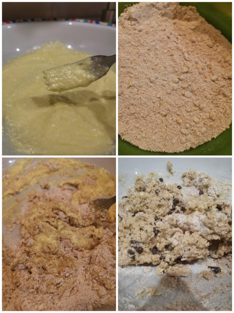 Die feuchte Mischung zu den trockenen Zutaten geben, die Schokoladenstückchen hinzufügen und mischen, bis ein weicher und leicht klebriger Teig entsteht.