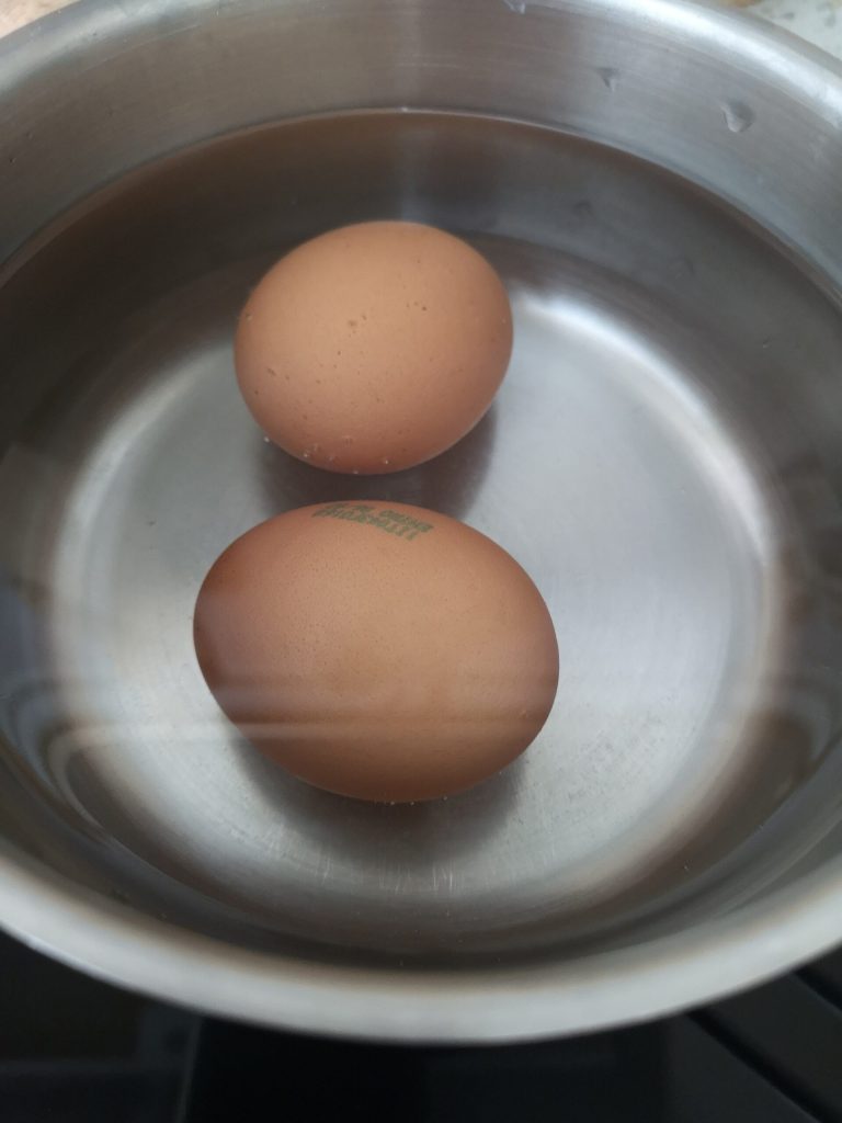 In der Zwischenzeit die Eier hartkochen in kochendem Wasser für etwa 9–10 Minuten.