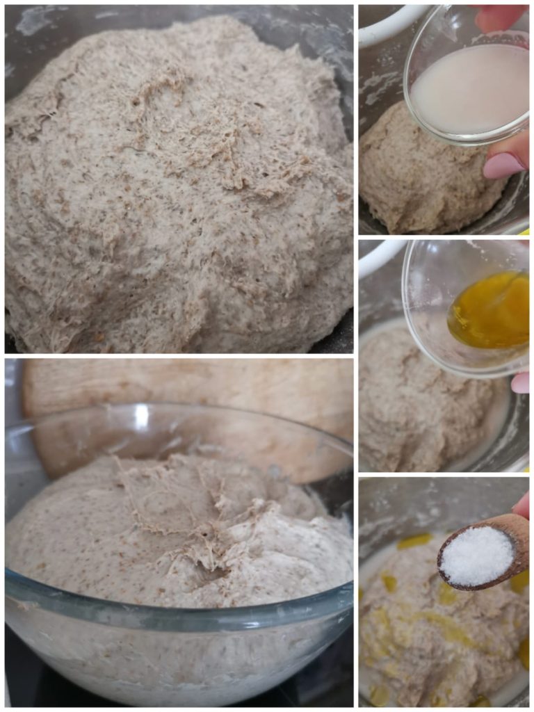 • Gib in eine Schüssel (oder in die Küchenmaschine) 700 g Wasser und füge das Dinkel- und das Vollkornroggenmehl hinzu.