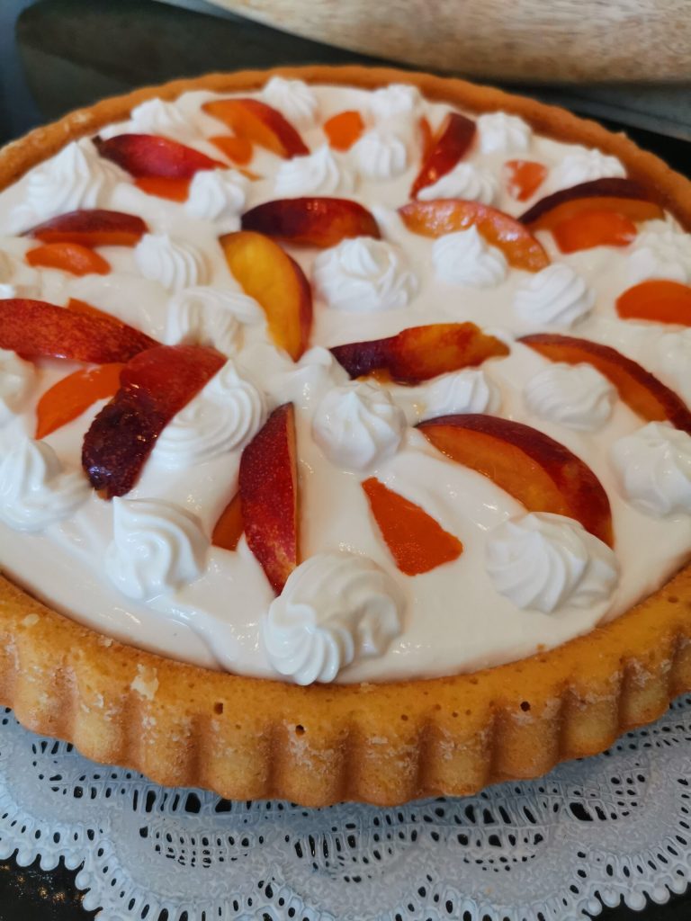 Ein Biskuitboden mit einer weichen und zarten Creme, in die frische, saisonale Früchte eintauchen.