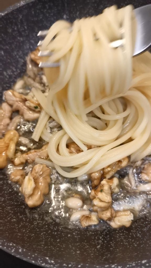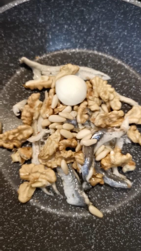 Nehmen Sie eine Pfanne, stellen Sie sie auf den Herd bei niedriger Hitze und fügen Sie die Sardellenfilets in Öl oder entsalzt hinzu, je nachdem, was Sie bevorzugen. Geben Sie die Walnusskerne dazu (Sie können sie ganz lassen oder hacken), die Pinienkerne, das Olivenöl, die Petersilie, den gehackten Knoblauch und die Chilischote (wenn Sie möchten). Meiner Meinung nach passt eine leichte Prise sehr gut.