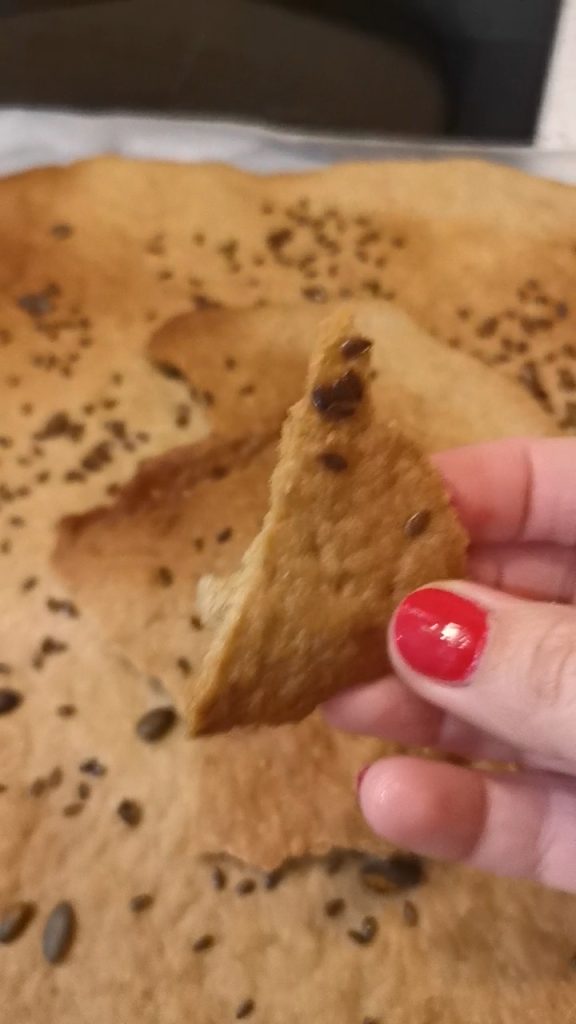 Sobald der Teig ausgerollt ist, fügen Sie, wenn Sie möchten, gemischte Samen und eine Prise feines Salz hinzu. Ich liebe den Geschmack von Samen, besonders wenn sie geröstet sind. Stellen Sie den Ofen auf vorgeheizte 190 Grad, Umluft für etwa 18 Minuten. Nach 15/16 Minuten kontrollieren Sie es oft, da es so dünn ist, könnte selbst nur eine Minute mehr beim Backen es verbrennen.