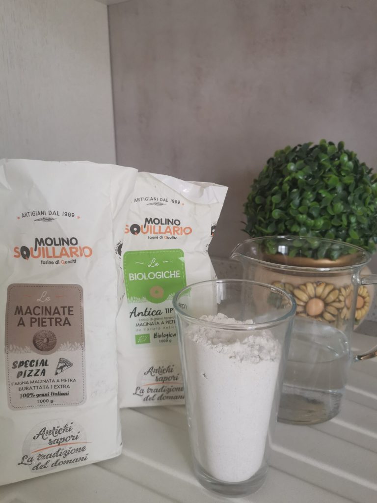 • Zuerst das Wasser, das Mehl und das Salz abwiegen. Dieses Mal habe ich, wie ihr auf dem Bild seht, eine Mischung aus zwei fantastischen Mehlen verwendet, ein Typ 1 und eine Spezial-Pizza, beide von Molino Squillario. Es sind außergewöhnliche Mehle.