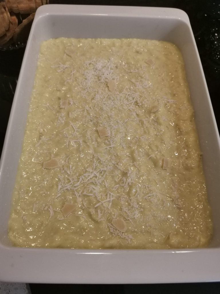 Wir legen unsere Mischung darauf, glätten sie ein wenig und vor dem Backen bestreuen wir die Oberfläche nochmals mit geriebenem Käse und Paniermehl.