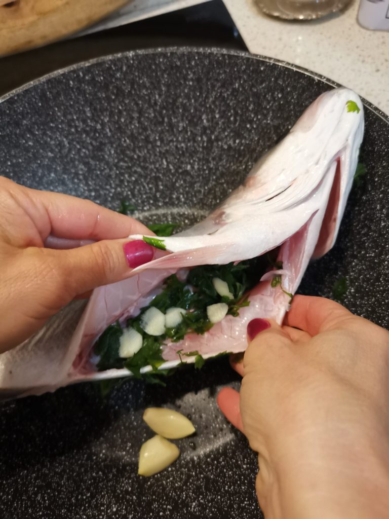 Zuerst spülen wir den Fisch ab und entfernen eventuelle verbleibende Schuppen. Wenn eure Fischhandlung gute Arbeit geleistet hat, oder besser gesagt, eine gute Reinigung, werdet ihr keine finden. Jetzt nehmen wir den Wolfsbarsch und legen ihn in die Pfanne, und wie auf dem Foto gezeigt, fügt ihr innen die fein gehackte Petersilie und den Knoblauch hinzu. So wird es besser gewürzt. Den anderen ganzen Knoblauch gebe ich ganz in die Pfanne.