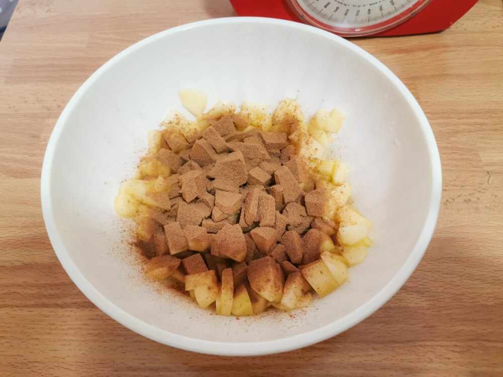 In der Zwischenzeit die Äpfel waschen und schälen, in Würfel schneiden und mit dem Saft von 1 Zitrone beträufeln, auch zwei Teelöffel Zimtpulver hinzufügen.Schließlich die Äpfel in den Teig einarbeiten und die Mischung in die gebutterten und bemehlten Förmchen füllen. Sie können auch Muffinförmchen oder solche aus Silikon verwenden, ohne sie buttern zu müssen.