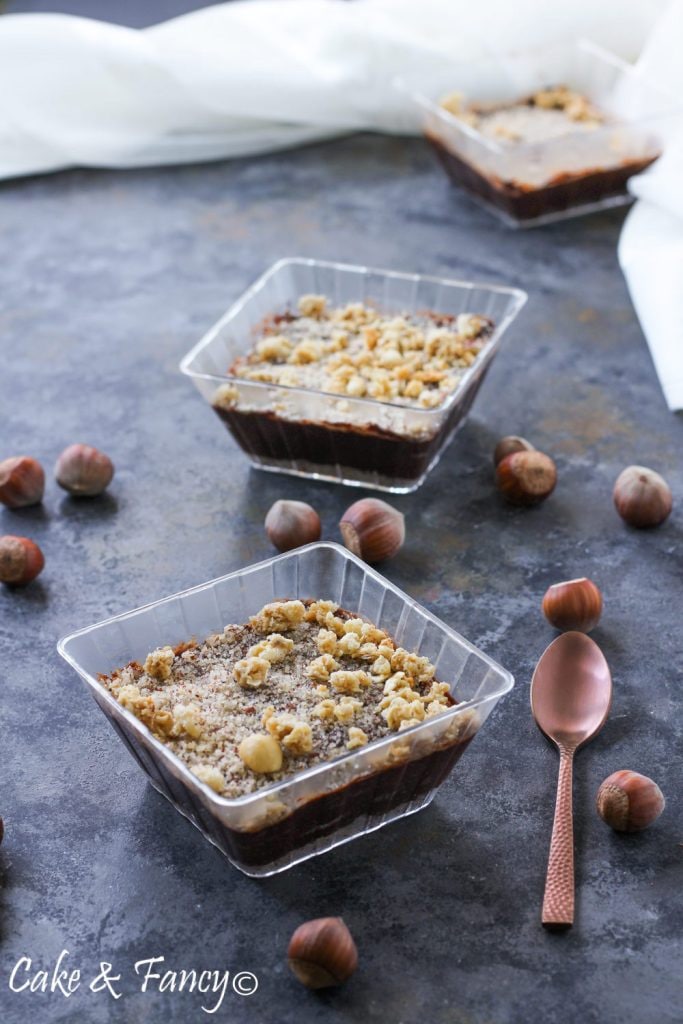 Jetzt gießen wir die Bananen-Schokoladen-Creme über die Haselnüsse, legen eine weitere Schicht gehackter Haselnüsse darauf und noch eine Schicht Creme. Zum Schluss bedecken wir alles mit mehr Krokant, und wer möchte, kann mit Müsli und ganzen Haselnüssen dekorieren.