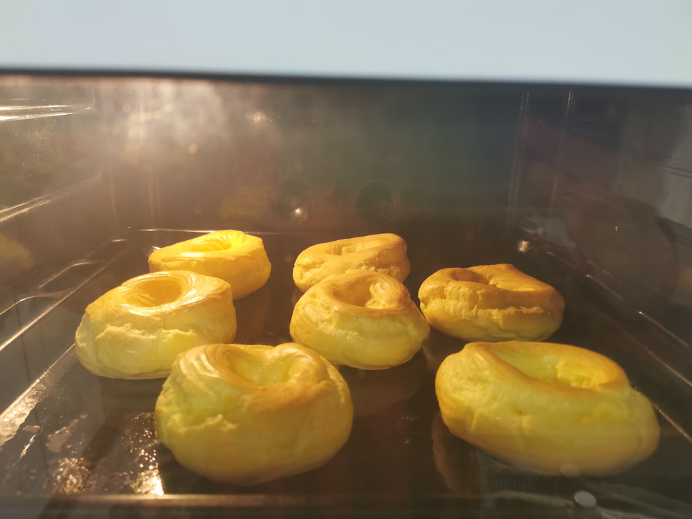 Die Zeppole formen und im Ofen backen. Ich bevorzuge Ober-/Unterhitze bei 200 °C für 20 Minuten; bei Umluft reichen 190 °C. Nach 10 Minuten die Bräunung prüfen und gegebenenfalls die Temperatur um 10 °C reduzieren, falls sie zu dunkel werden. Nach den ersten 20 Minuten einen Holzlöffel oder eine kleine Alufolienkugel zwischen Backofentür und Türrahmen klemmen und weitere 10 Minuten backen. So trocknen sie innen und färben sich außen schön. Backzeit und Temperatur sind Richtwerte — passe sie an deinen Ofen an.