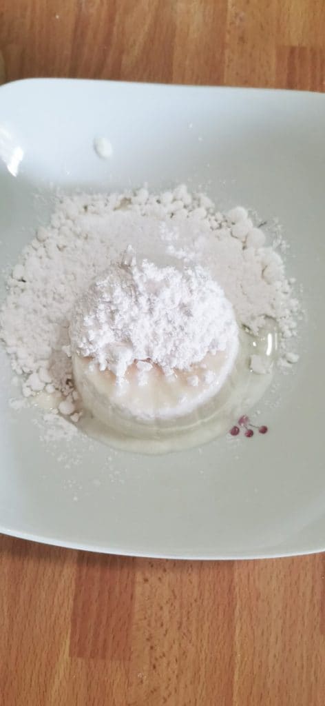 Während der Mürbeteig im Kühlschrank ruht, bereiten wir die Füllung vor: In einer Schüssel mischen wir den Kuhricotta mit dem Puderzucker, ich habe den aus dem Becher verwendet, weil er sehr cremig bleibt.