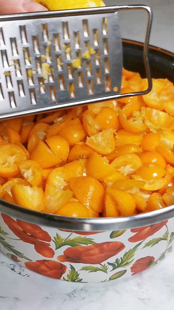 Waschen Sie die Mandarinen und lassen Sie sie mindestens 6 Stunden in kaltem Wasser einweichen, damit die Schale hydratisiert und weich wird. Schneiden Sie sie anschließend in zwei Hälften oder alternativ in Scheiben und entfernen Sie alle Kerne.