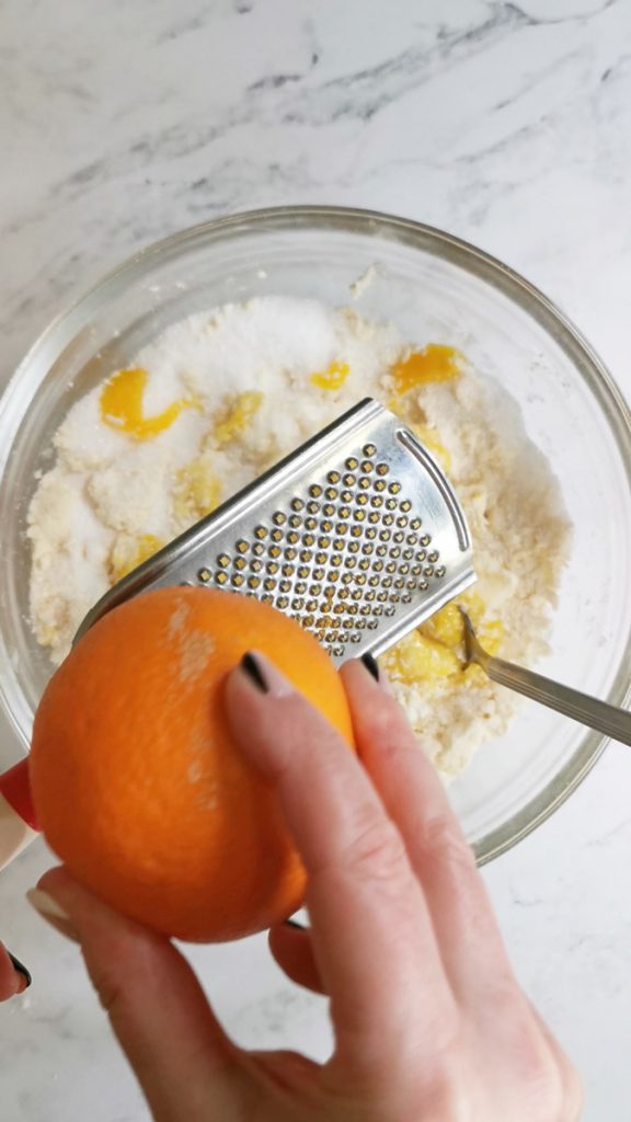 Die abgeriebene Orangenschale hinzufügen, dann den Teig mit den Händen gut durchkneten. Den Teig auf eine Arbeitsfläche geben, wenn nötig etwas Wasser hinzufügen, aber nur wenn nötig. Am Ende sollte ein glatter und homogener Teig entstehen, was etwa 10 Minuten dauert. Nun den Teig bei Raumtemperatur unter Frischhaltefolie für mindestens 20 Minuten ruhen lassen.