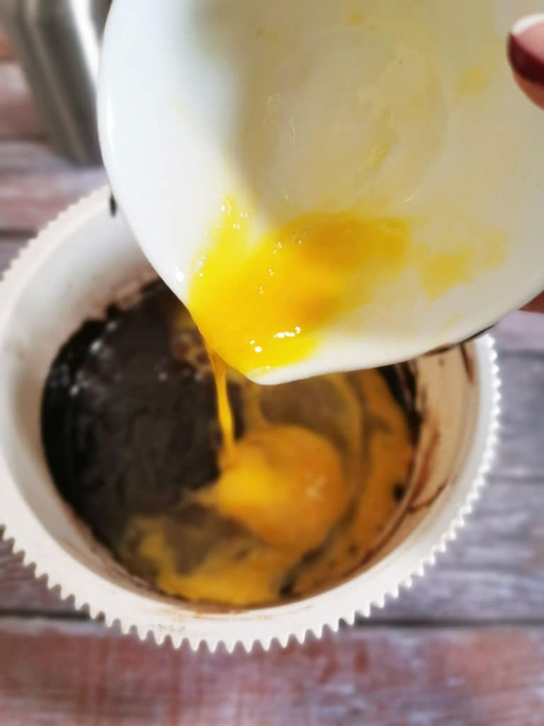 • In einen antihaftbeschichteten Topf die Butter in Stücke schneiden, die Schokolade, den Zucker und die Milch geben. Alle Zutaten bei niedriger Hitze schmelzen lassen, aber nicht zum Kochen bringen. Gelegentlich umrühren und darauf achten, dass nichts am Topfboden klebt, sonst ist die Mischung nicht mehr zu retten und neue Zutaten für den Mud-Cake müssen hinzugefügt werden. (Eine gute Alternative kann das Wasserbad sein).