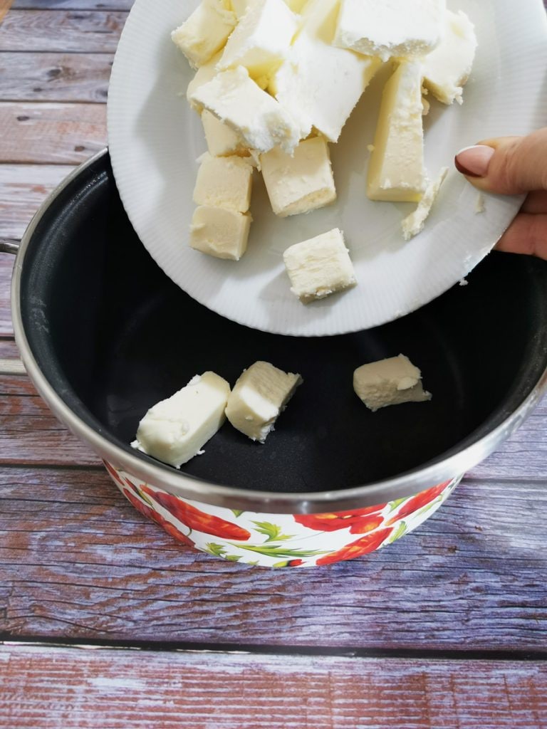 • Wenn die Zutaten vollständig geschmolzen sind, die Mischung etwa 15/20 Minuten abkühlen lassen, dabei gelegentlich umrühren. Sobald es fertig ist, in die Küchenmaschine „mit Schneebesen“ geben.