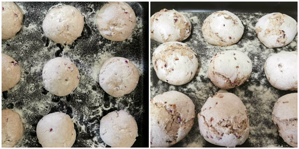 Jedes Stück bearbeiten und jedem eine runde Form geben, alle Brötchen gleich groß machen, dann auf einem antihaftbeschichteten Backblech mit genügend Abstand legen.