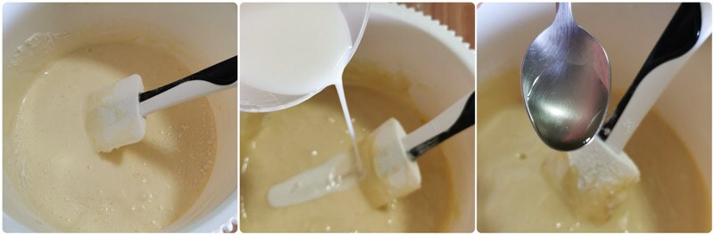 Schlagen Sie die Eier mit dem Zucker, bis sie hell und schaumig sind. Fügen Sie das Sonnenblumenöl hinzu, während Sie weiter schlagen. Sobald die Mischung fertig ist, fügen Sie das gesiebte Mehl und das Backpulver hinzu.
