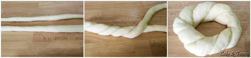 • Aus dem geteilten Teig gleich große Kugeln formen, aus den Kugeln Stränge formen, die an den Enden paarweise verbunden werden. Dann die Stränge verdrehen und eine Krone formen.