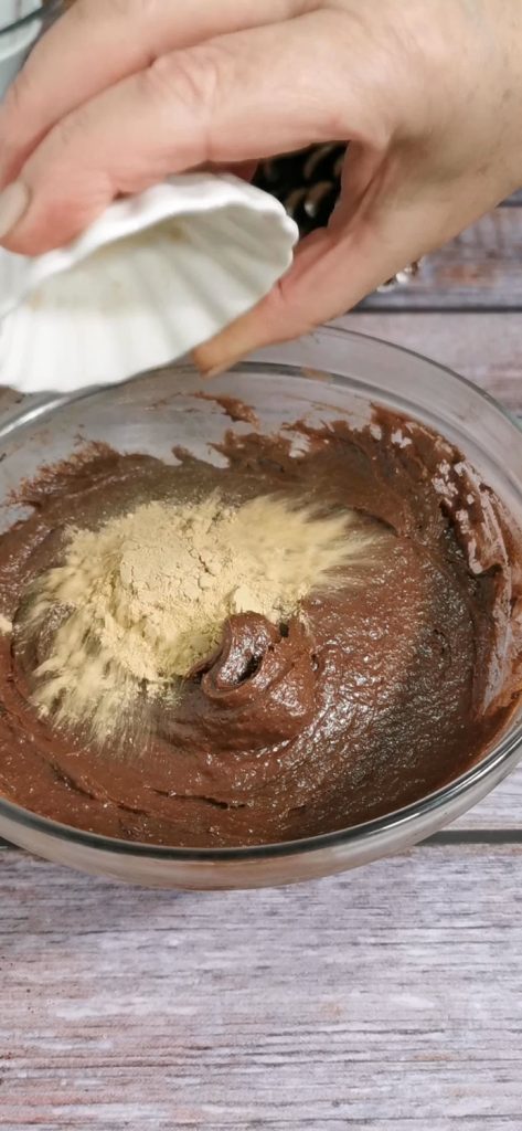Rühren Sie, um die Zutaten zu mischen, fügen Sie schließlich das Ingwerpulver und die Walnüsse hinzu. Sobald der Teig fertig ist, gießen Sie ihn in eine mit Backpapier ausgelegte Form (30×30).