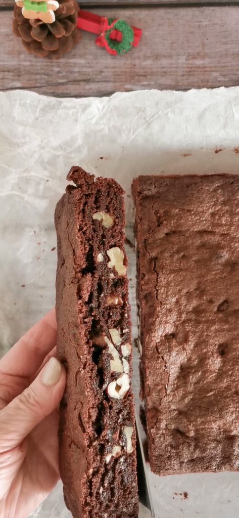 Oberfläche gut glätten und im vorgeheizten Ofen bei 180°C (Ober-/Unterhitze) für 30/35 Minuten backen, denken Sie daran, dass die Backzeit nur ein Richtwert ist, orientieren Sie sich immer an Ihrem Ofen. Machen Sie den Stäbchentest: Stecken Sie den Stäbchen in die Mitte, er sollte mit ein paar Krümel herauskommen, um einen perfekten Brownie zu haben; innen weich, zum Schmelzen im Mund und mit einer leichten, knusprigen Kruste außen. Aus dem Ofen nehmen und in der Form abkühlen lassen, dann in Quadrate schneiden und mit Puderzucker oder den Lebkuchenmännchen dekorieren und genießen!