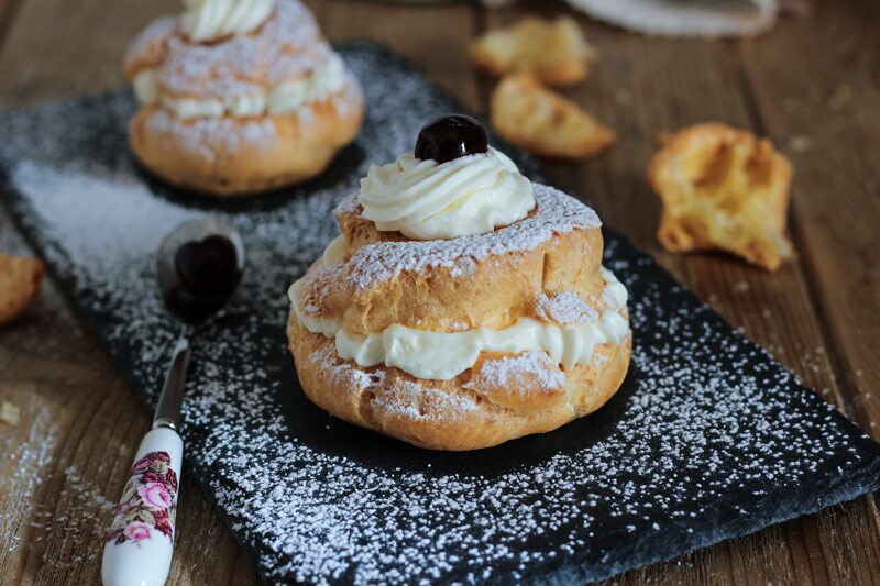Die Zeppole di San Giuseppe sind traditionelle Süßigkeiten des 19. März, die zum Vatertag zubereitet werden, sie haben eine lange Geschichte, ihre Entstehung ist von vielen Legenden und Traditionen umgeben. Eine davon scheint auf das alte Rom zurückzugehen, als die I Liberalia gefeiert wurden, römische Feste zu Ehren von Liber pater. Ein Fest, das am 17. März abgehalten wurde, um den sechzehnten Geburtstag eines Jungen zu feiern. Man feierte den Übergang ins Erwachsenenalter mit Rechten und Pflichten des römischen Bürgers, indem man köstliche Krapfen aß und viel Wein trank. Eine andere christliche Legende erzählt von der Flucht der heiligen Familie nach Ägypten; es scheint, dass sich Joseph, um Maria und Jesus zu ernähren, neben dem Beruf des Zimmermanns auch dem des Straßenfritteurs näherte und süße Krapfen auf der Straße verkaufte. Auch wenn die Tradition will, dass die Zeppole in reichlich Öl oder besser noch in Schmalz frittiert werden, um dann mit viel Vanillecreme gefüllt zu werden, empfehle ich Ihnen, diese nicht frittierte Version zu probieren, insbesondere mit weißer Schokolade, weil sie wirklich den Unterschied machen!