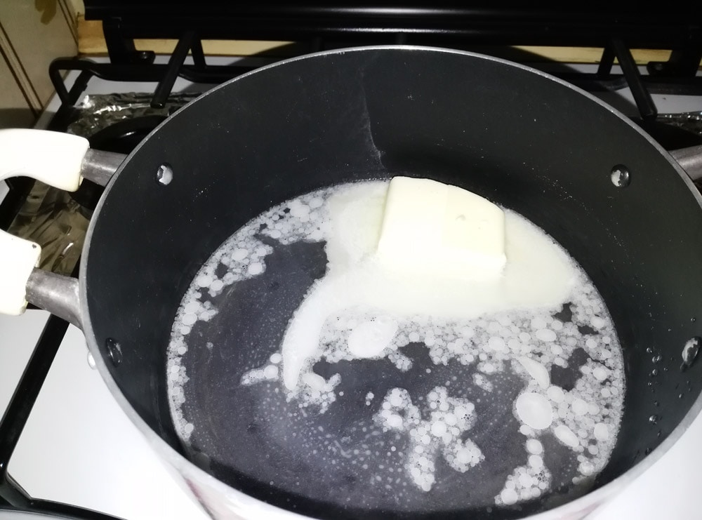In einem Topf geben wir das Wasser, das Salz und die in Stücke geschnittene Butter, bringen es zum Kochen und nehmen es vom Herd. Wenn die Butter nicht vollständig geschmolzen scheint, genügt es, die Mischung mit einem Holzlöffel umzurühren.