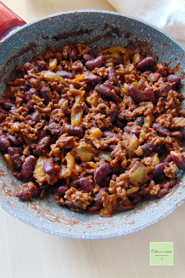 Die ‚richtigen‘ Zutaten sind fast alle vorhanden: das Hackfleisch, die grüne Paprika, die Bohnen, der Chili (nun ja, es ist kein original mexikanischer Chili, sondern einer aus der Romagna 😁), und schließlich habe ich eine köstliche Mischung aus Tex-Mex-Gewürzen verwendet, dieselbe Gewürzmischung, die ich in dem Rezept für den würzigen gratinierten Fenchel verwendet habe, erinnert ihr euch?