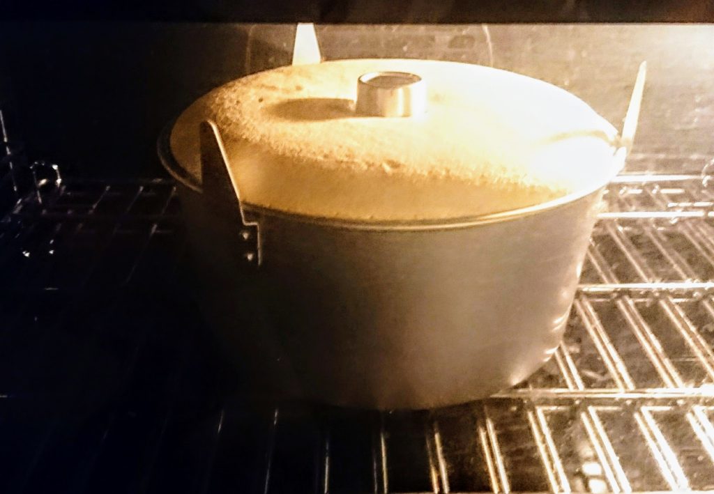Entferne den Chiffon-Kuchen aus dem Ofen und drehe die Form sofort um, indem du das zentrale Loch auf eine Flasche steckst oder auf den Füßen abstellst (wenn vorhanden).
