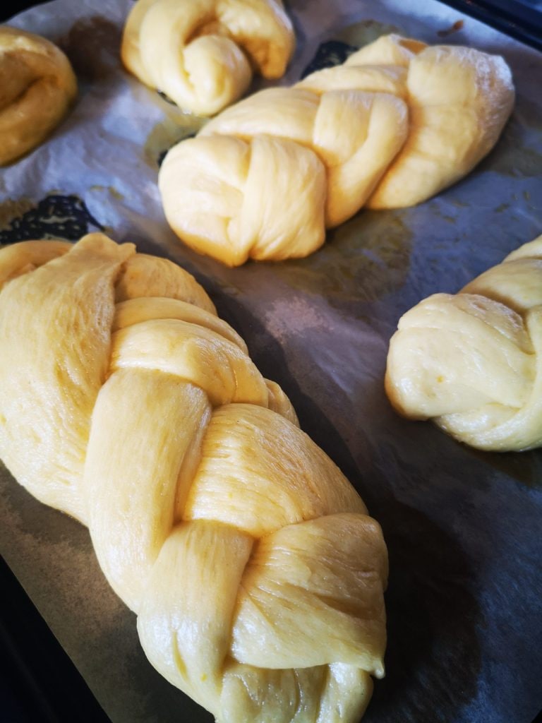 Sobald die Zöpfe geformt sind, legen wir sie auf ein mit Backpapier ausgelegtes Blech und warten, bis sie sich verdoppeln.